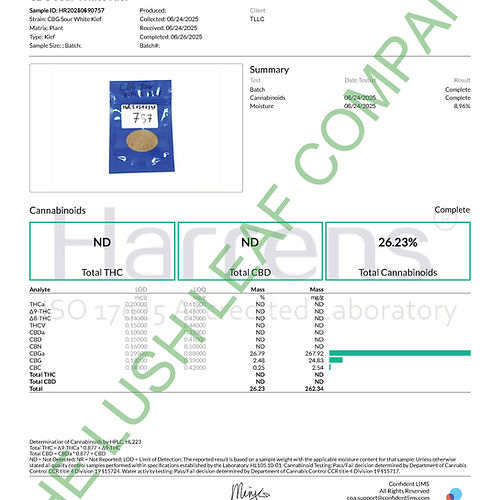 Discover the unparalleled quality of our Bulk Premium CBG Kief ~25-30% potency at The Lush Leaf Company, your first choice for affordable cannabinoid, hemp, and CBD products. Our fresh, high quality, premium CBG Kief is often referred to as the "mother cannabinoid" due to its rich cannabigerol content and unique therapeutic properties. With the best pricing on the market and many strains to choose from, we can handle any size order, ensuring you receive the perfect product to meet your needs. Trust The Lush Leaf Company for a superior experience in CBG Kief solutions.